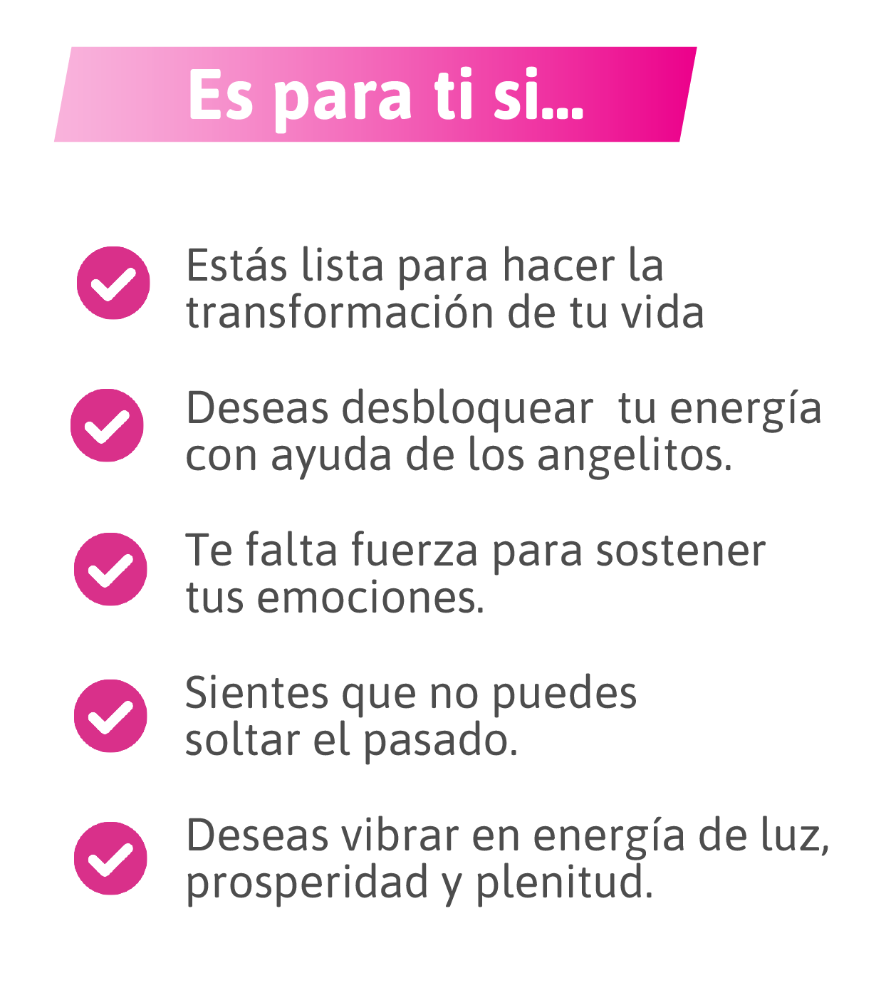 Al entrar al reto adquieres acceso a nuestro whatsapp y si hiciste el pago completo podrás estar en las sesiones angelicales en vivo.